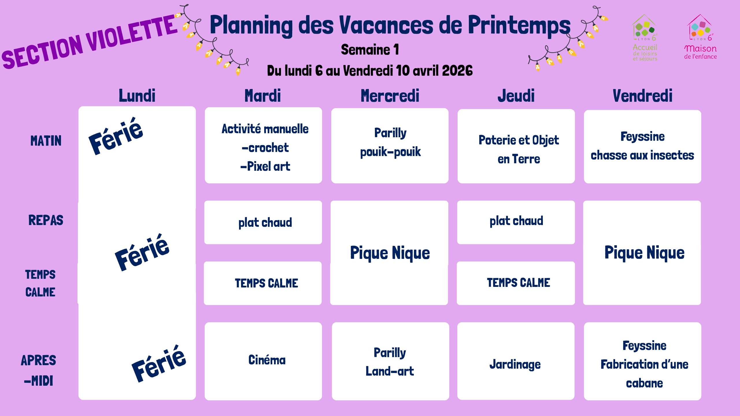 PROGRAMME SEMAINE DU 7 AVRIL AU 10 AVRIL SECTION VIOLETTE (7/8ans )